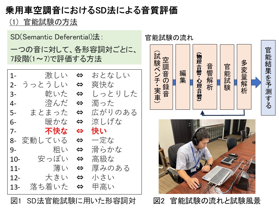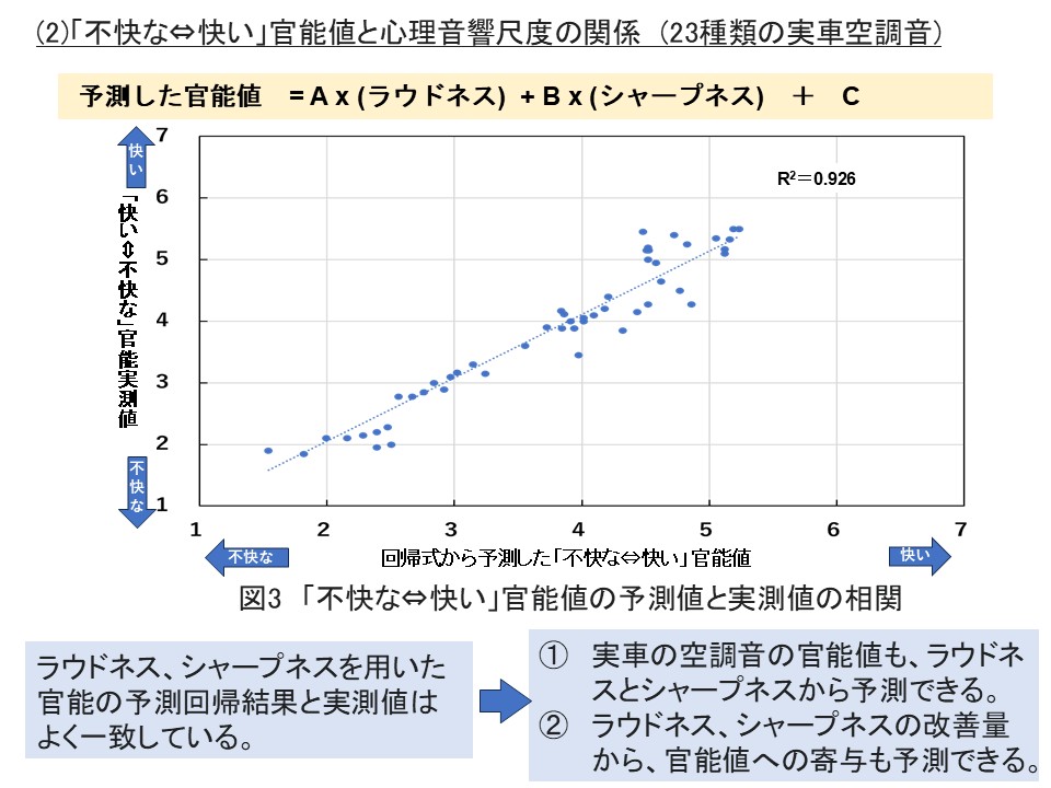【空調音の音質評価】自動車の空調音に対して、SD法(反対の意味を持つ形容詞の対を用いて7段階の評価をする官能試験法の一つ)をもちいて、音の感じ方を評価した。その空調音の心理音響尺度も合わせて分析して、官能値との相関を調べた。その結果から、空調音の「不快⇔快い」官能値は、心理音響尺度のラウドネスとシャープネスを用いて、予測することが可能であることが分かった。この予測式を実際の車の空調音に適用したところ、大変高い精度で、官能値が予測できていることが実証できた。 |