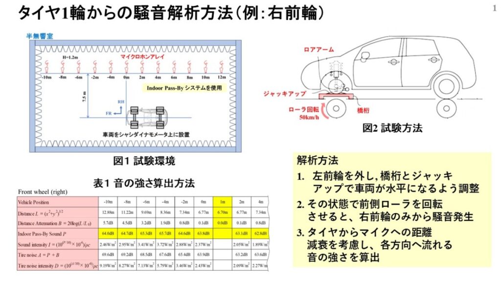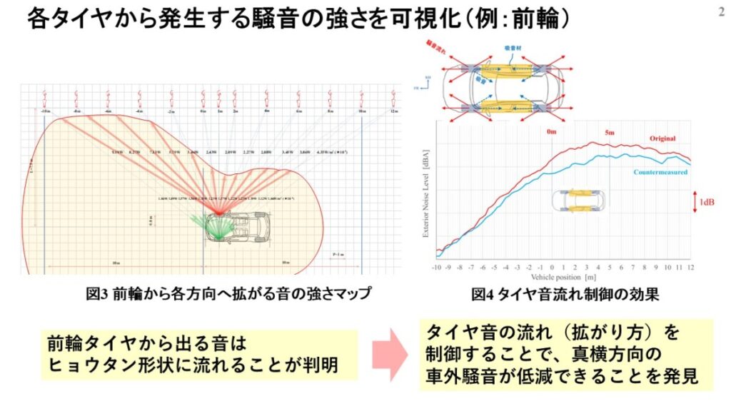 【タイヤ騒音評価】「車外騒音規制が厳しくなる中、タイヤ騒音をボデー側でも対策するニーズが生じている。 対策検討のため、まず音がタイヤのどこからどのように拡がって車外騒音になるのかを解析した。その結果、1つのタイヤから音が「ヒョウタン」形状で前後方向に波及することを発見した。また、前輪・後輪の音の拡がりを制御することで車両横方向に拡がるタイヤ騒音を低減できることを見出した」 |